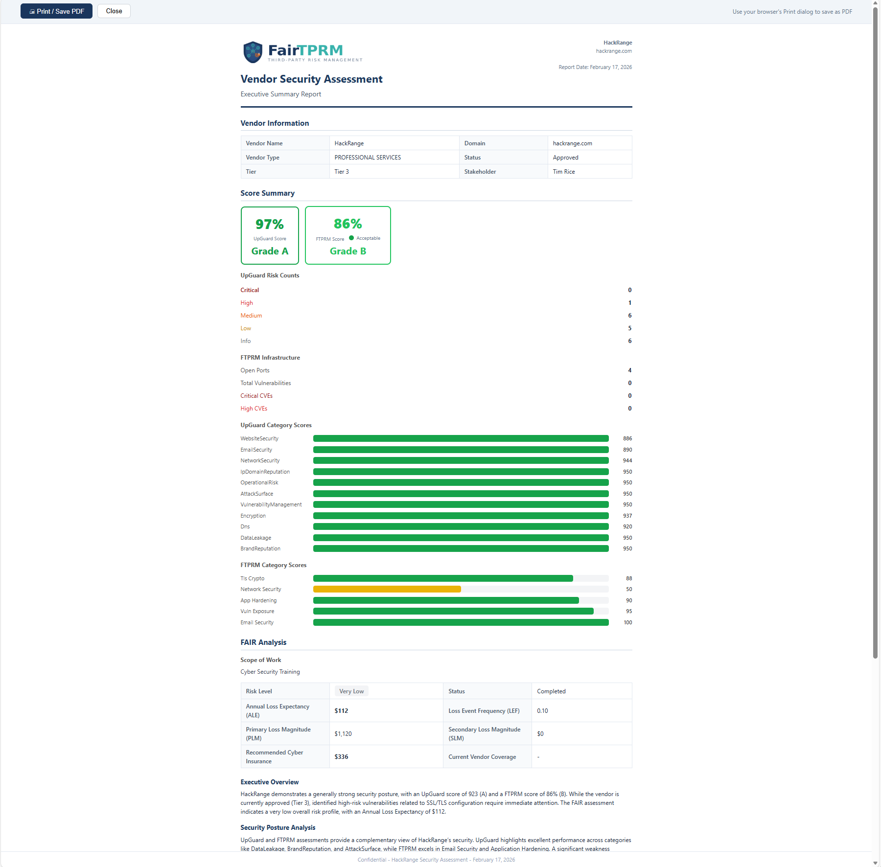 Implements the FAIR™ methodology, developed by the FAIR Institute, to convert vendor risk into Annualized Loss Expectancy (ALE) with recommended cyber insurance coverage. Every multiplier and threshold is customizable.