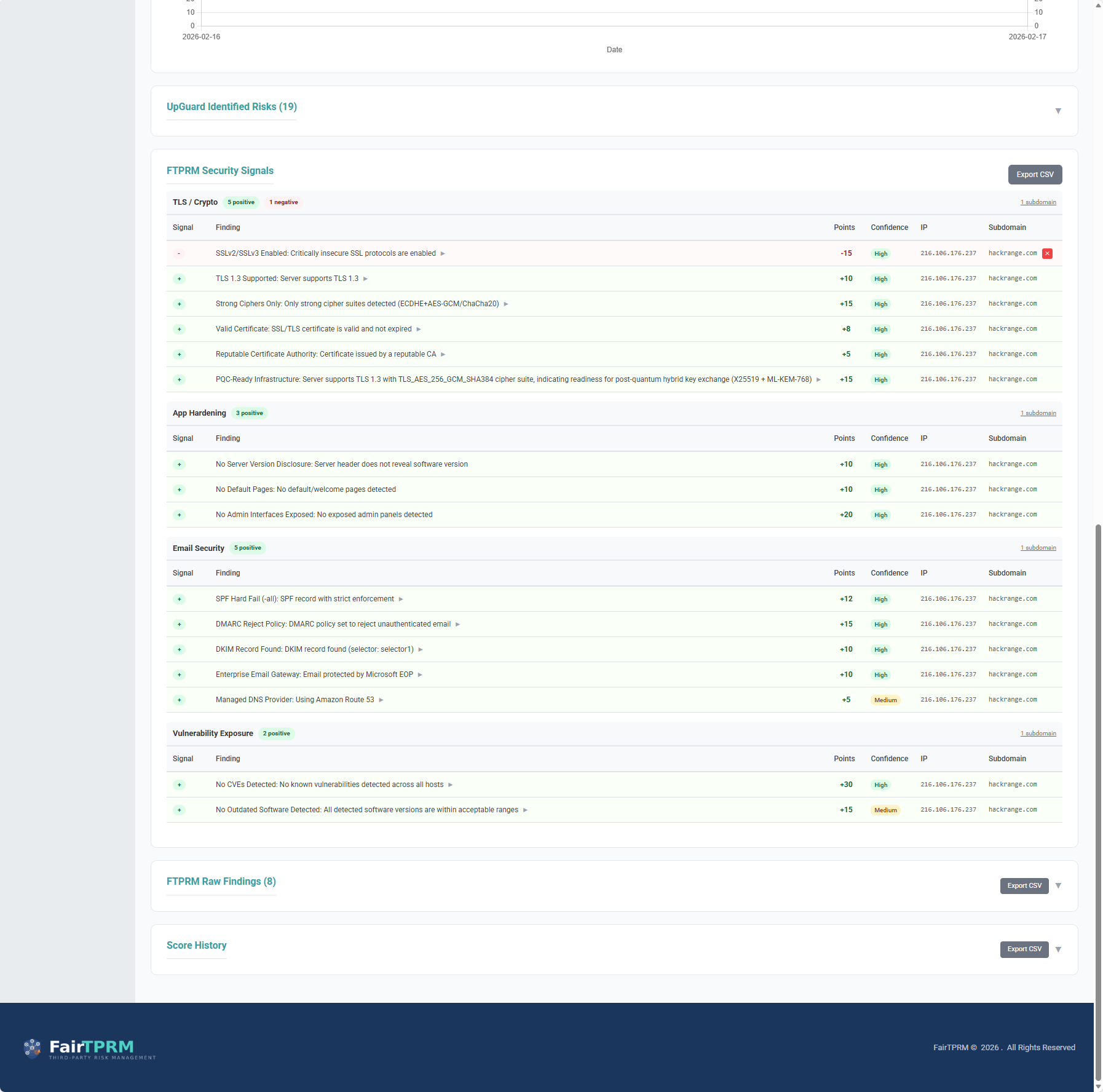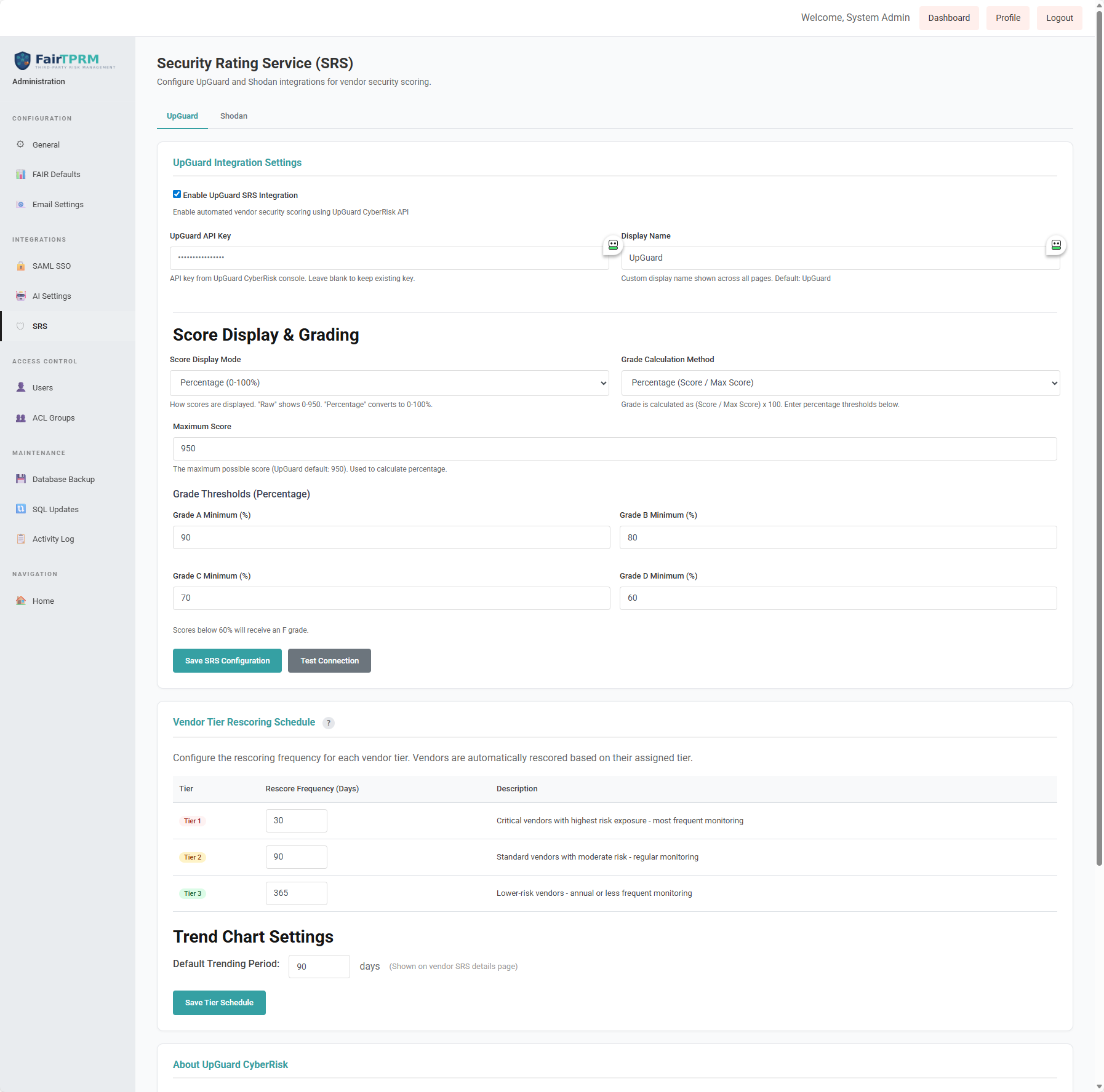 Built-in API integrations with UpGuard and Shodan provide continuous external scanning with admin-tunable signal weights per scoring category. You decide which security signals matter most to your organization.