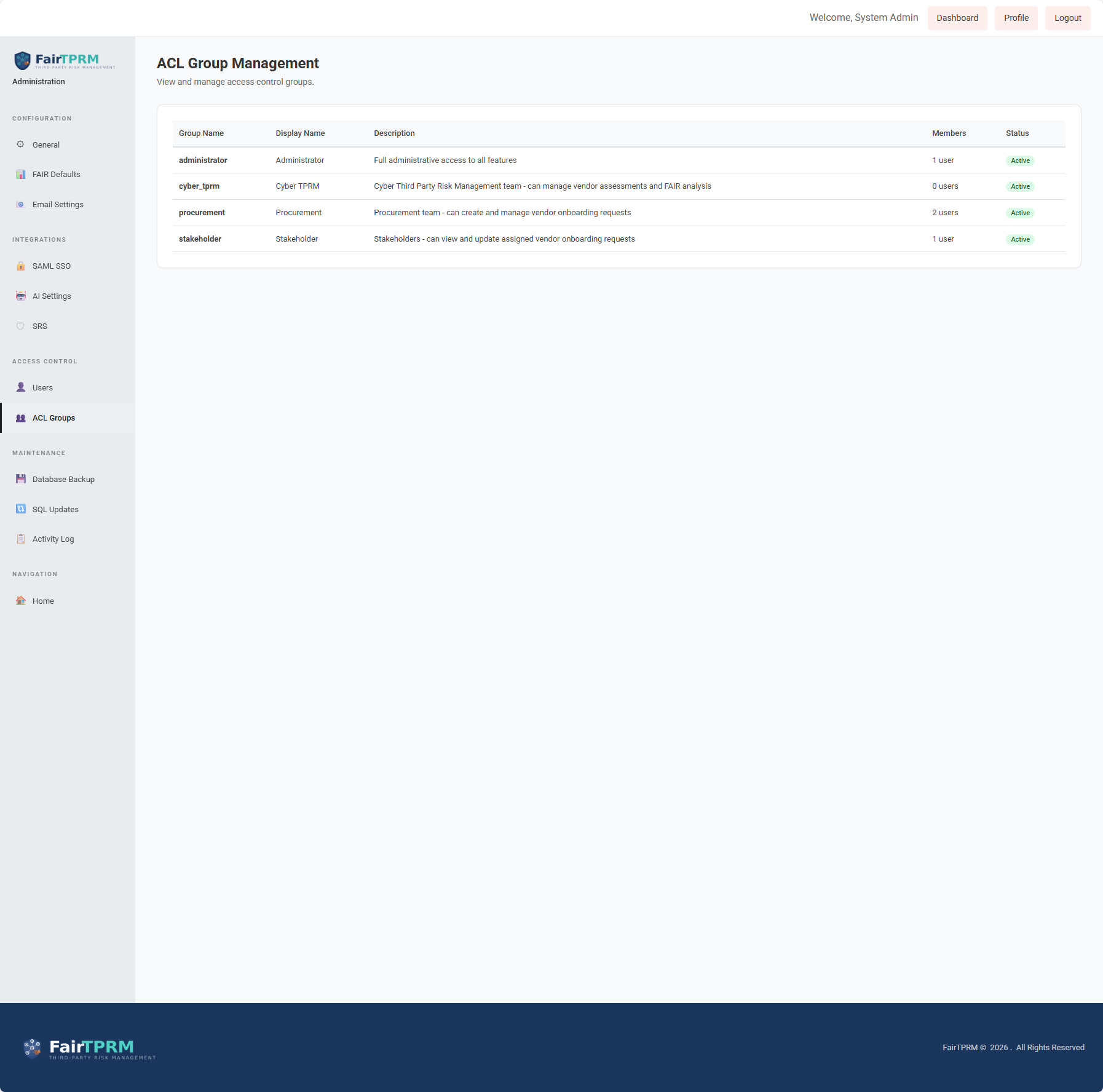 One unified permission model across every module — no per-tool access configurations. Seven default groups cover the full range of TPRM and GRC responsibilities.