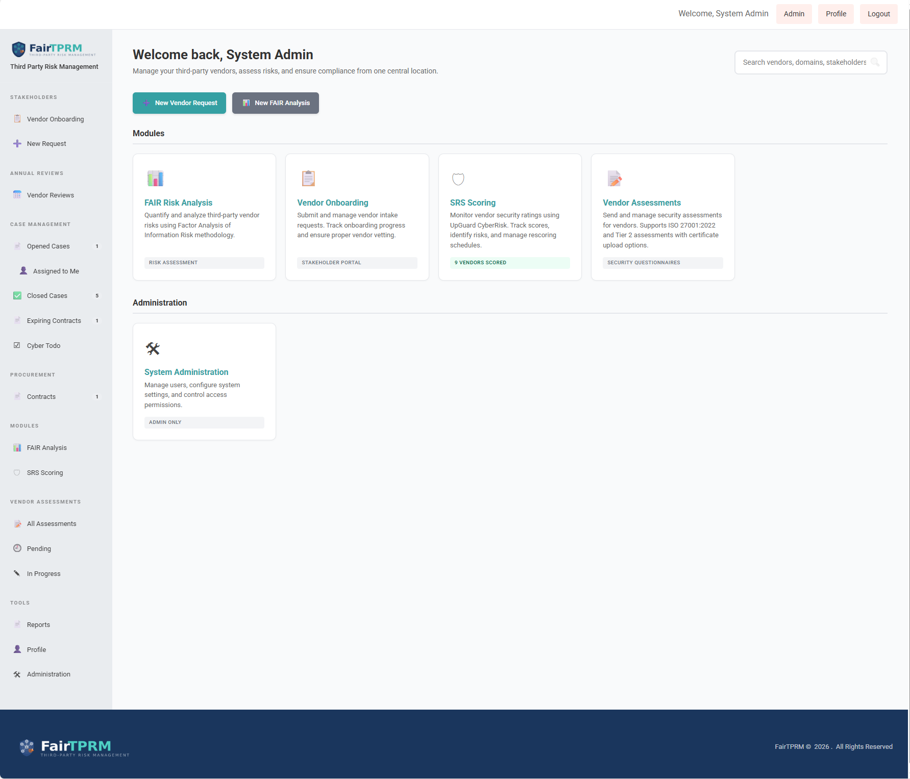 See Fair TPRM in action — from dashboards and risk analysis to vendor lifecycle management and administration.