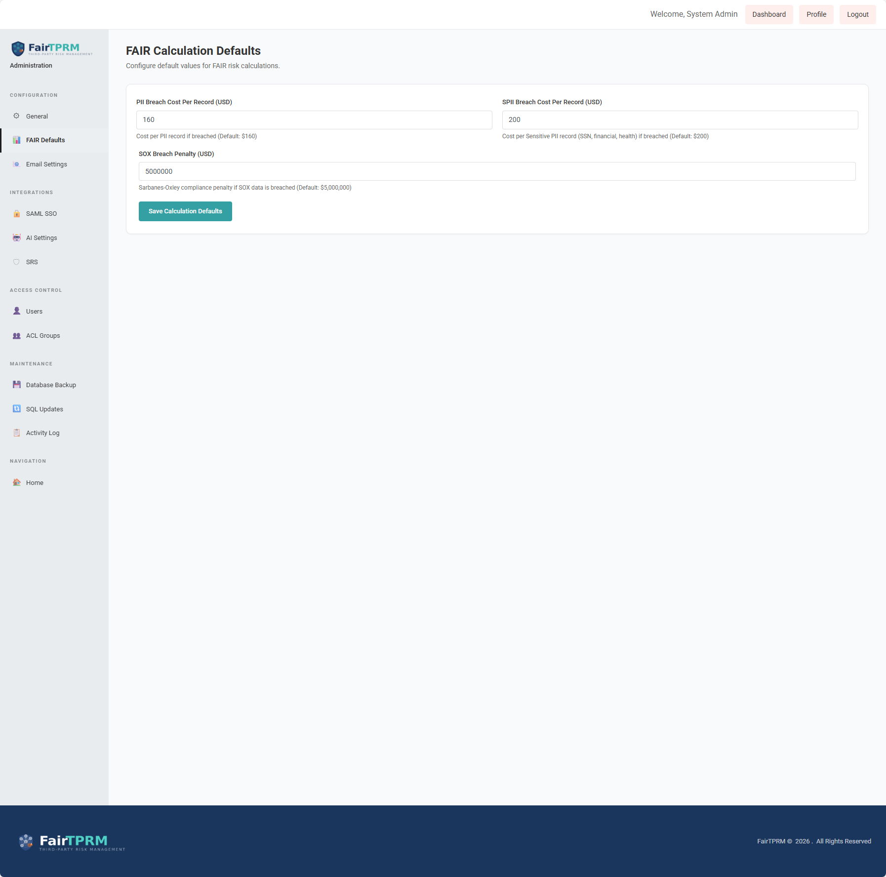 Implements the FAIR™ methodology, developed by the FAIR Institute, to convert vendor risk into Annualized Loss Expectancy (ALE) with recommended cyber insurance coverage. Every multiplier and threshold is customizable.